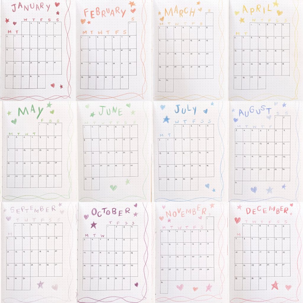 I decided to use coloured pencils to create this setup to make the whole thing feel really fun and creative. For each month, I picked two similar shades of coloured pencils in rainbow order (so January was two shades of red, February was two shades of orange etc.).