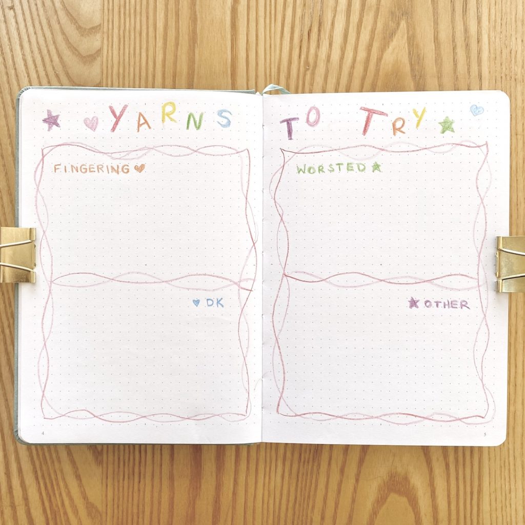 The next spread is the Yarns to Try spread, where Mum can keep track of any yarns that she’s interested in and would like to try knitting something with at some point. I’ve split this spread up into 4 sections: Fingering weight, DK weight, Worsted weight and Other (i.e. the three yarn weights Mum uses most, plus a space for all the other weights, just in case!).