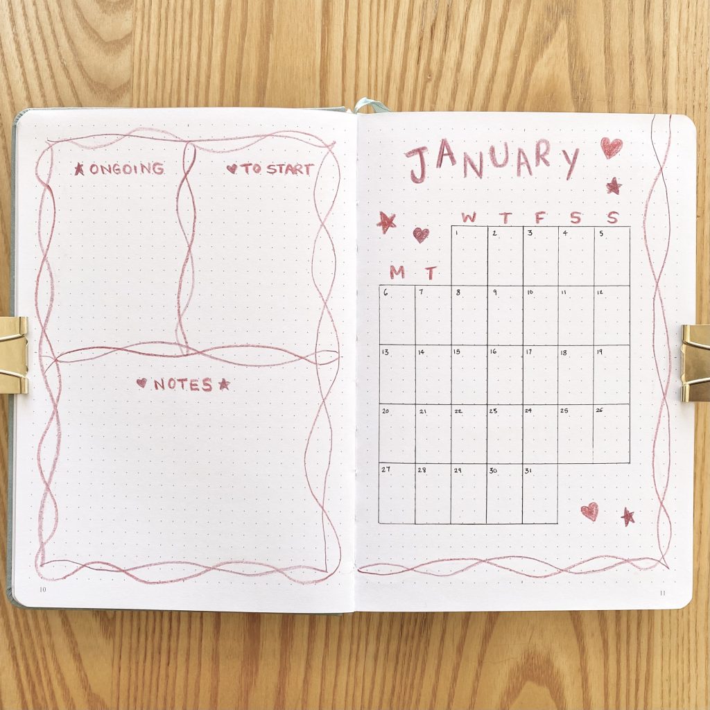 It’s always a risk trying out a new notebook (I’m specific about what I like!), but I really loved using this one! The dot-grid pages are thick (and numbered!), the notebook has an elastic closure, pen holder and back pocket AND the design of the cover is so lovely. The best thing about the notebook, though, is that the centre of each page is (discreetly) marked with a +, while the centre of each side is marked with a short line. I was a little suspicious of these markings at first, because I was worried that they would be too visible on the finished spreads, but they really disappear into the designs (even the simple ones, like I’ve done here) and I can’t even BEGIN to explain how HELPFUL they are. They really sped up the whole setup process for this journal and it was so luxurious not having to constantly measure/count as I went. I did notice, however, that one of the other Tiefossi journals (the purple version of the Gold Vintage Dot Grid Notebook) I purchased did not contain these markings, so maybe this is only a feature in certain notebooks?