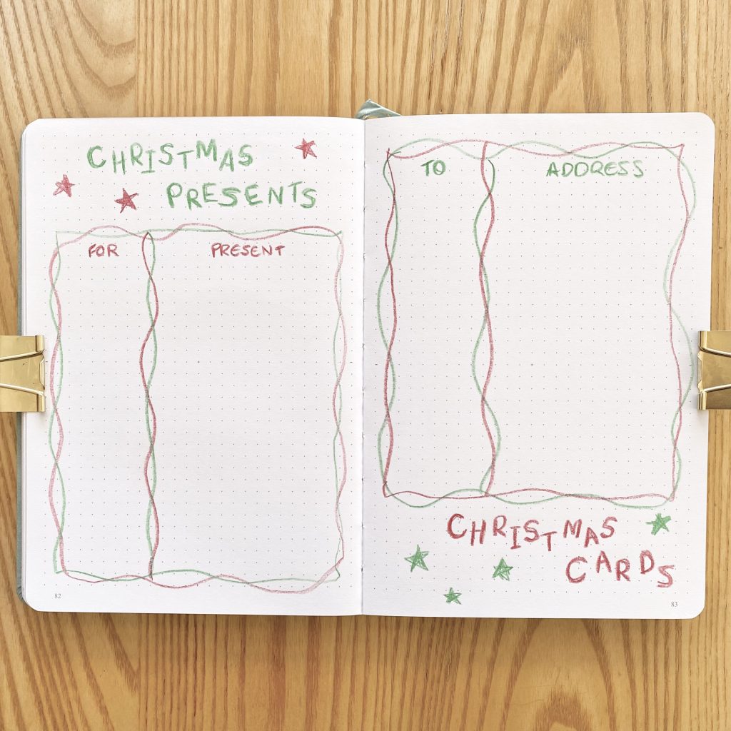 In the December monthly section, right at the end of the journal, there’s an extra Christmas spread (because Christmas always requires a lot of planning!). For this spread, I used red and green as my two coloured pencil shades (because what’s more festive than that?). This festive spread is split into two sections: Christmas Presents and Christmas Cards.