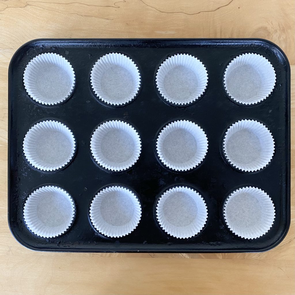 Start by lining a 12-cup fairy cake tin with paper liners and set it aside, ready for later.