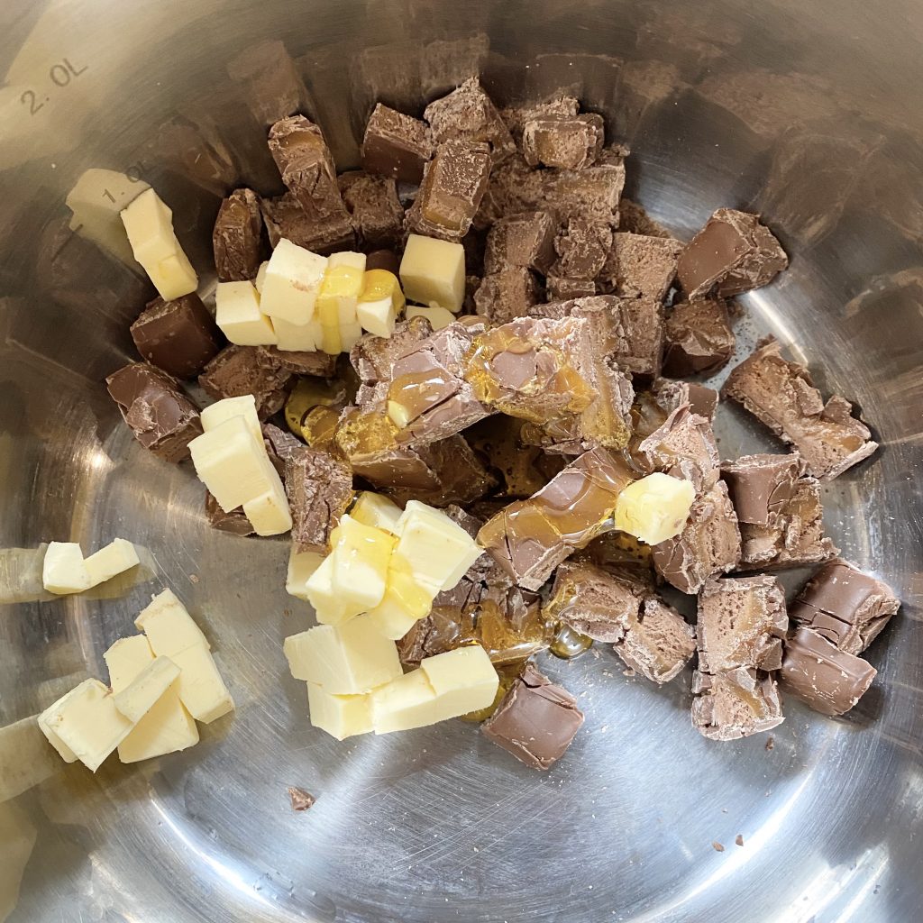 Mars Bars are chocolate-y, so the mixture will seize up and split if it’s overheated. Stick to a low heat, stir frequently and make sure to chop up both the Mars Bars and butter beforehand to ensure they melt evenly.