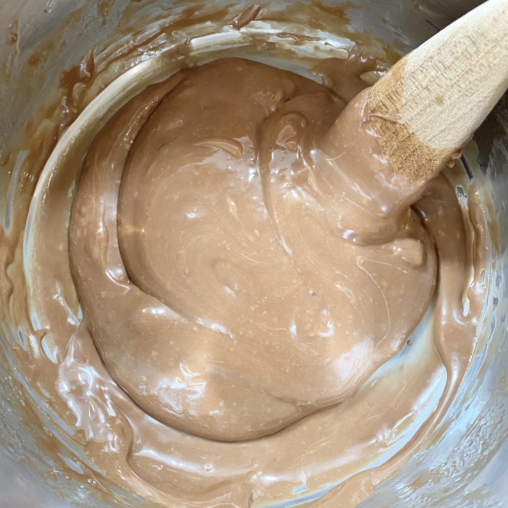 Stir frequently while everything melts together. Eventually, you’ll end up with a smooth, thick and shiny mixture, like this.