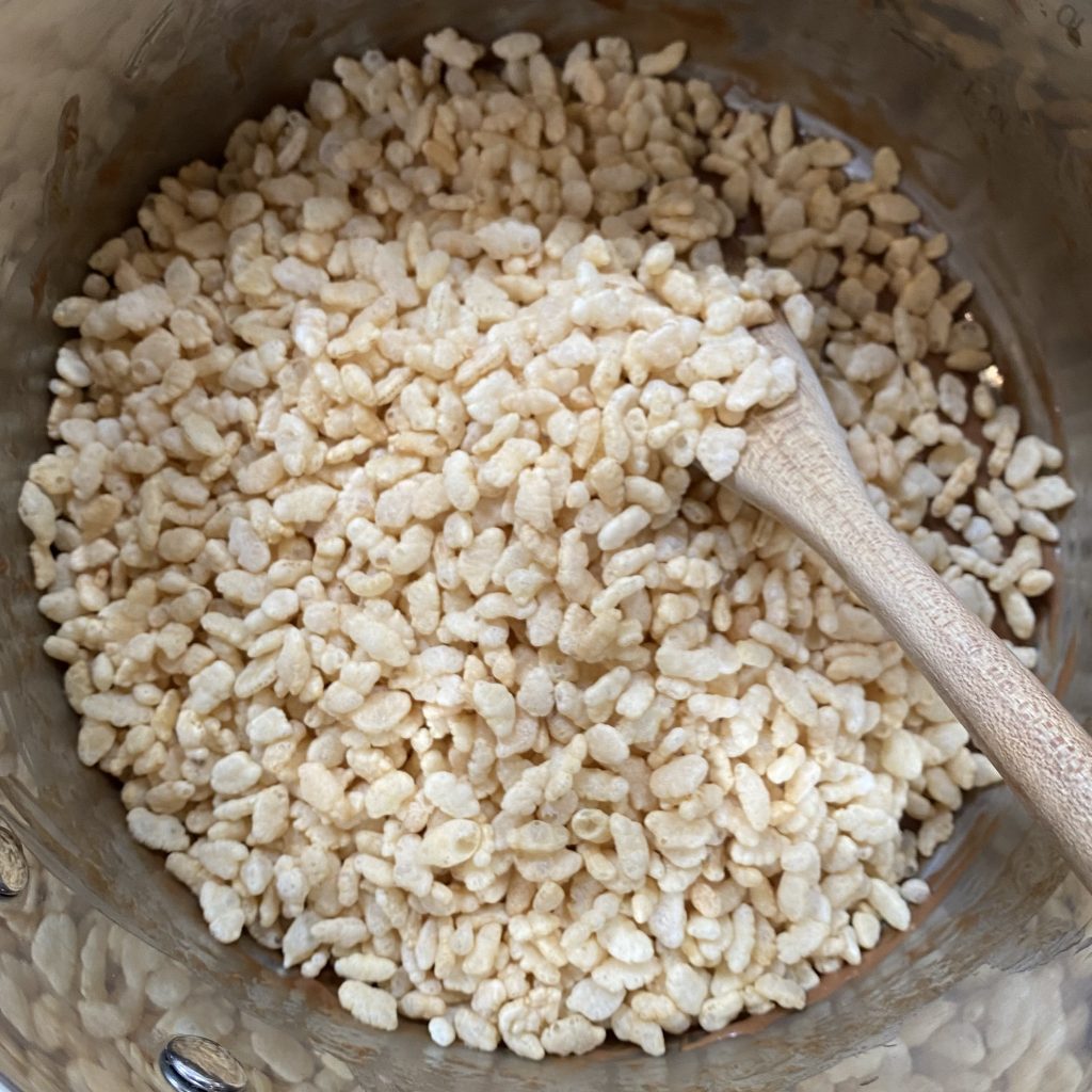 Take the pan off the heat and immediately stir through the rice crispies.