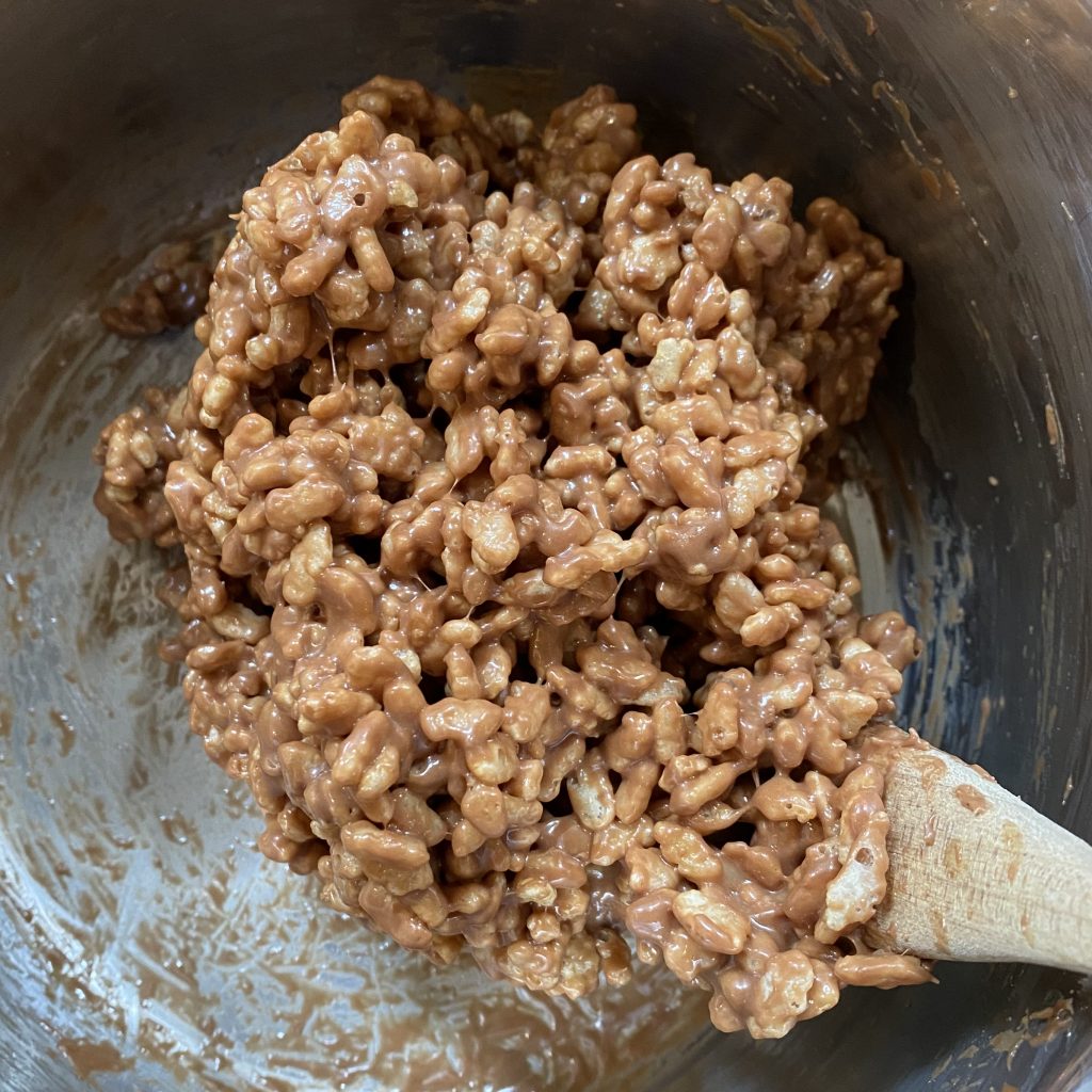 - Remove the pan from the heat and immediately tip in the rice crispies. Working quickly, stir through the cereal until all of the rice crispies are completely coated in the Mars Bar mixture.