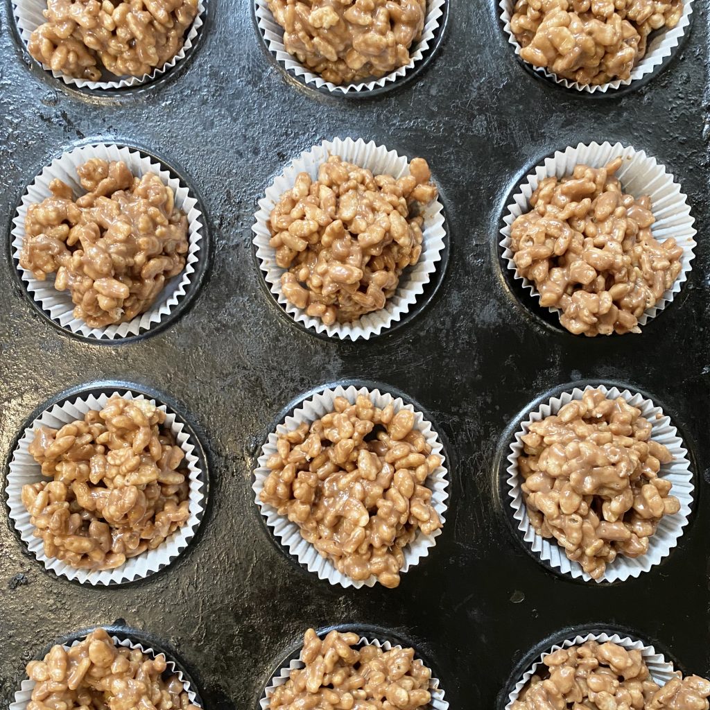 Still working quickly, use two dessertspoons to divide the rice crispy mixture between the 12 fairy cake cases (about a generously heaped dessertspoon’s worth of mixture per case).
