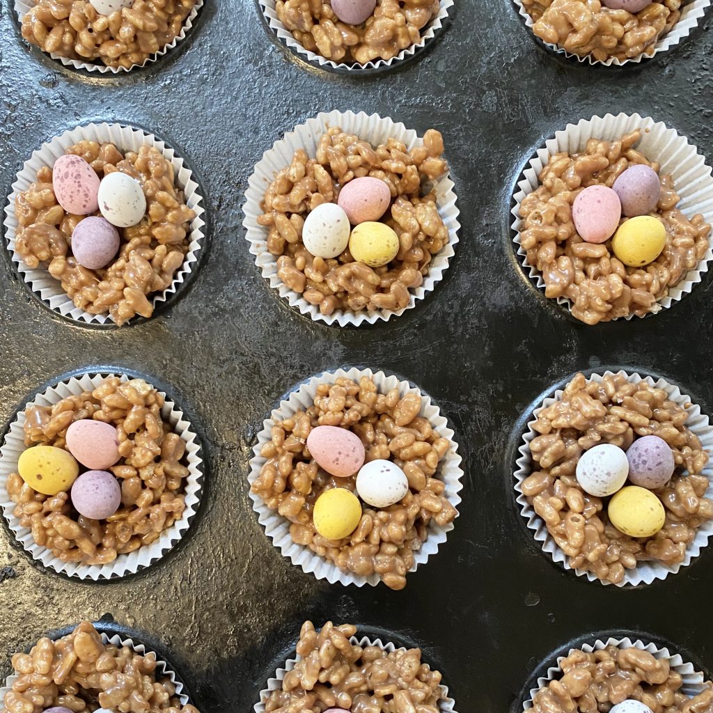 Because the Mars Bar mixture gets harder to work with as it cools, you need to start working quickly as soon as you take it off the heat. That includes when you’re mixing in the cereal, dividing it between the fairy cake cases and adding the Mini Eggs. One of the reasons this recipe is so good to make with children is that it means you have a second pair of hands— you can be dividing up the mixture while they press in the eggs!