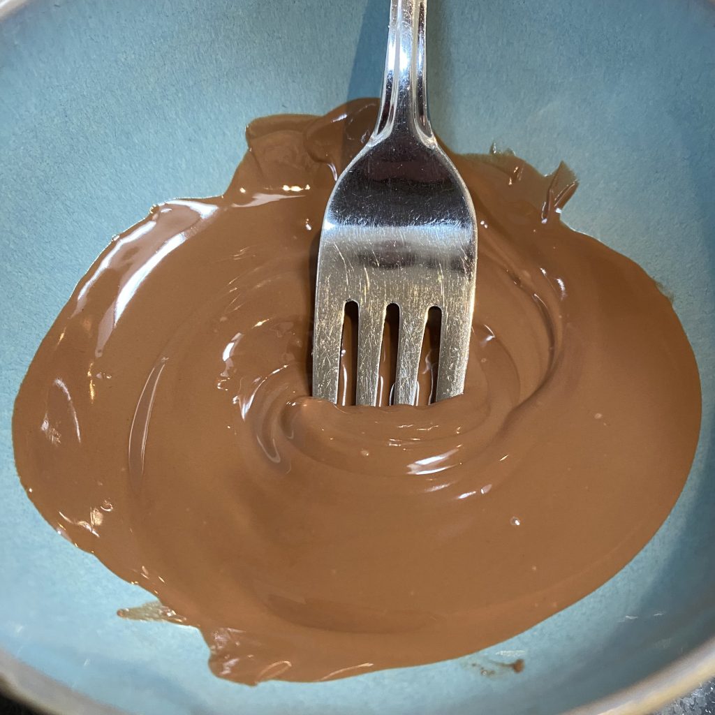 The final step is to drizzle over some melted chocolate. I like to use a fork for this for ease (I think the tines help to get the drizzle effect!).