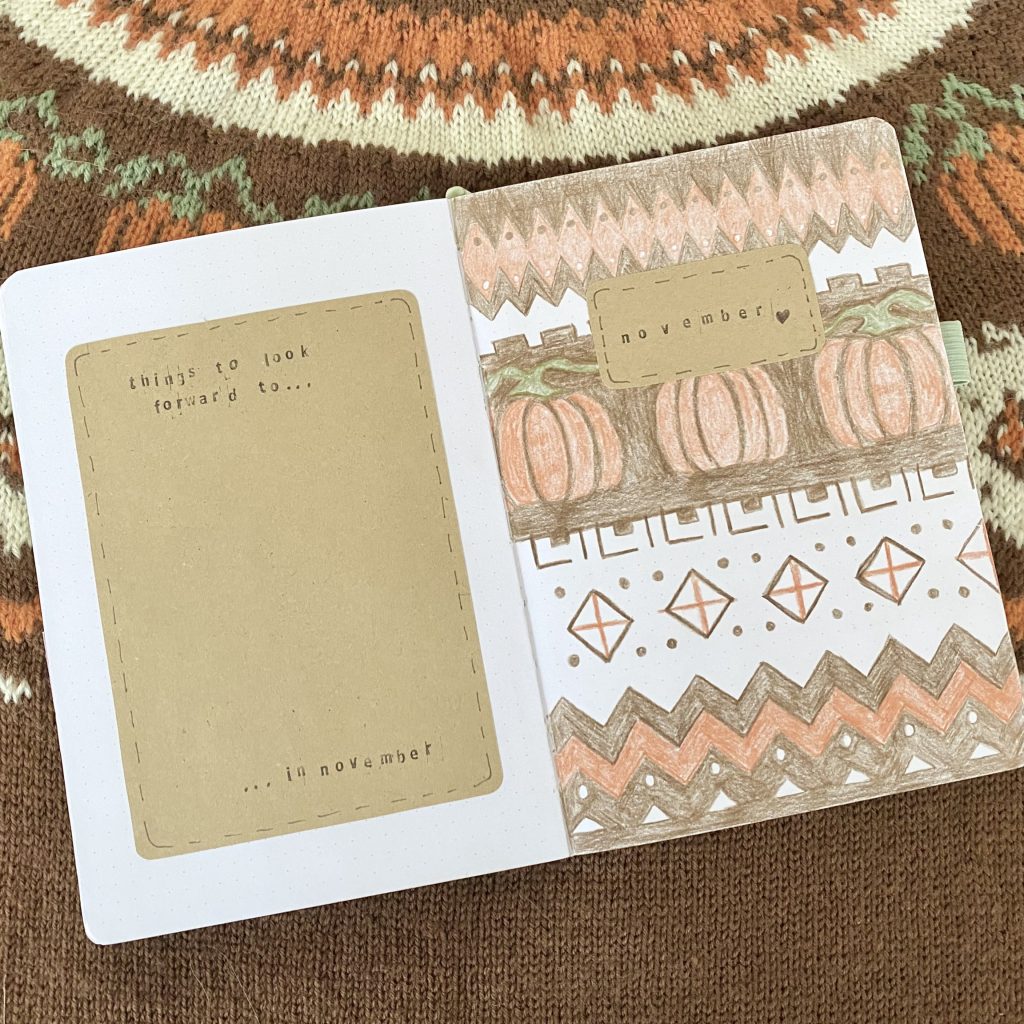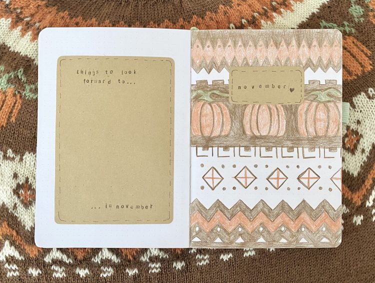 My November bullet journal setup started out life as my October bullet journal setup (which never actually came into existence, as a result of the aforementioned lack of enery). I had an idea for a setup inspired by one of my favourite knitting projects: my Pumpkin Strange Brew Sweater, with colouring pencil ‘colourwork’ designs and kraft paper accents. By the start of October, I’d just about managed to finish the layout & coloured patterns, but hadn’t gone beyond that and made the setup, you know… functional.
