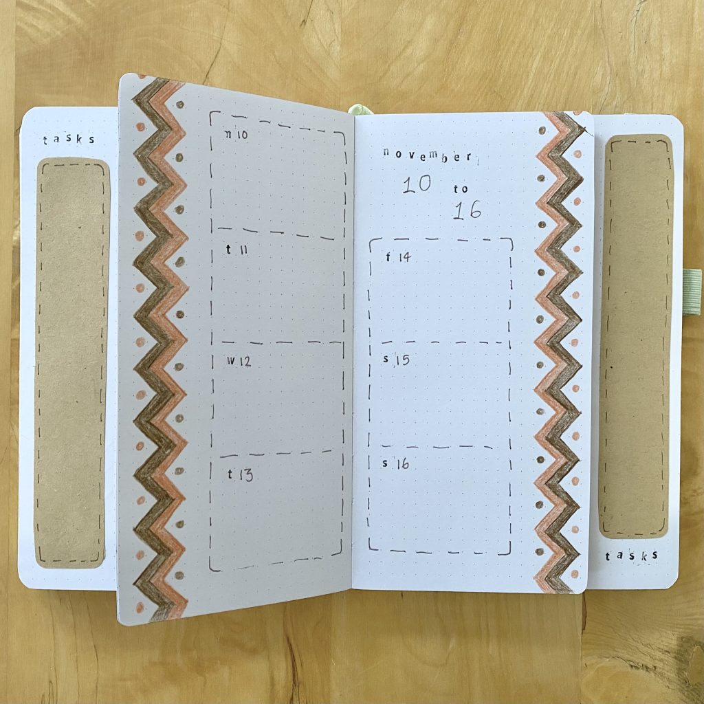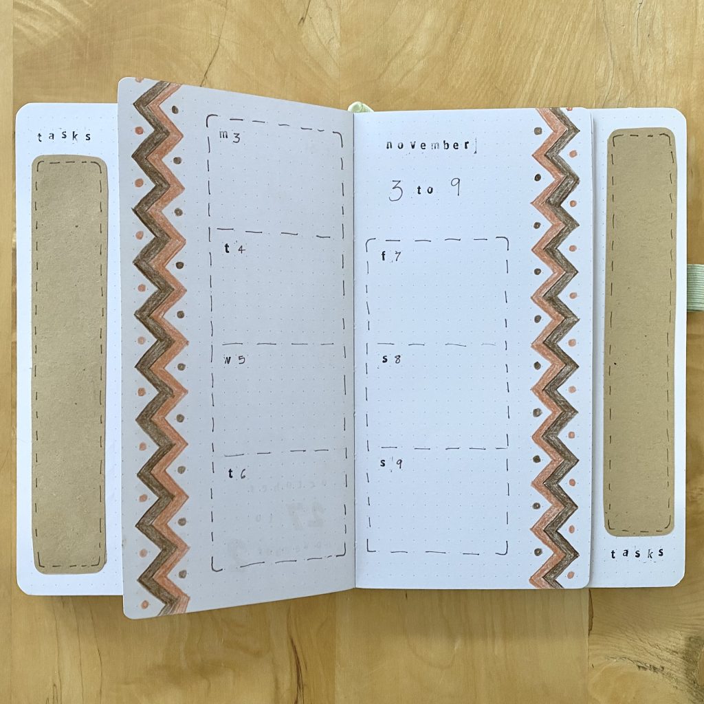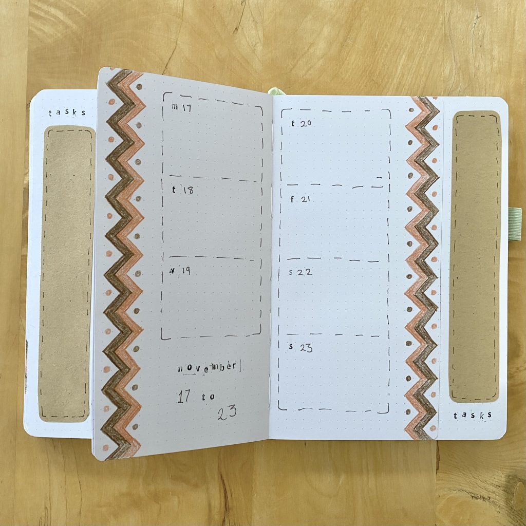 To protect my sanity, I opted to draw just the chevron pattern from my colourwork design as the decoration on most of the other pages in this setup, and for my Monthly Calendar I opted to place it near the bottom. For the calendar itself, I stuck in little squares of kraft paper, then wrote in the dates with my brown fineliner (the alphabet stamps I was using sadly do not contain numbers). Finally, I stamped in the ‘November’ heading vertically, down the left-hand side of the page.