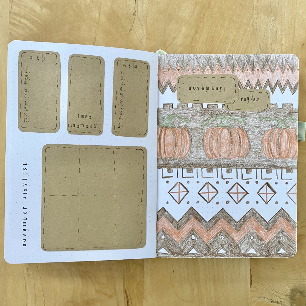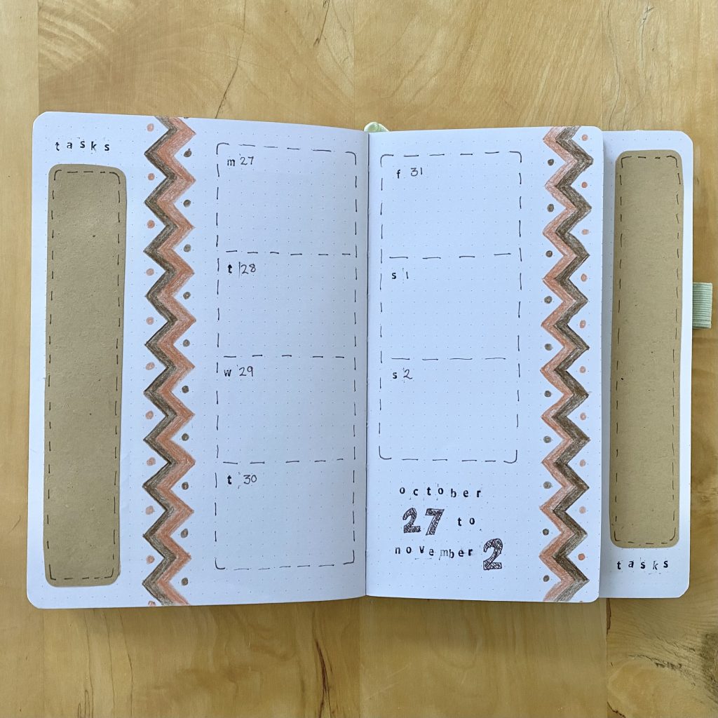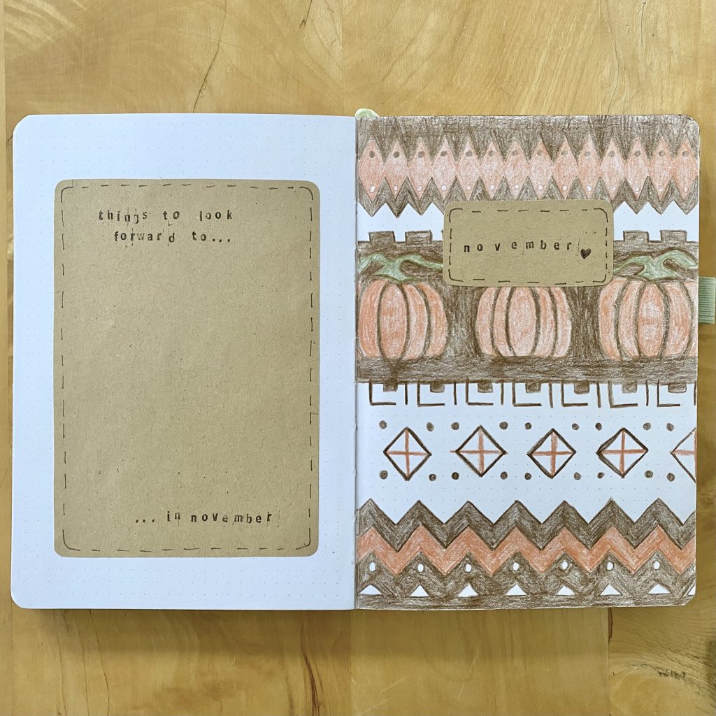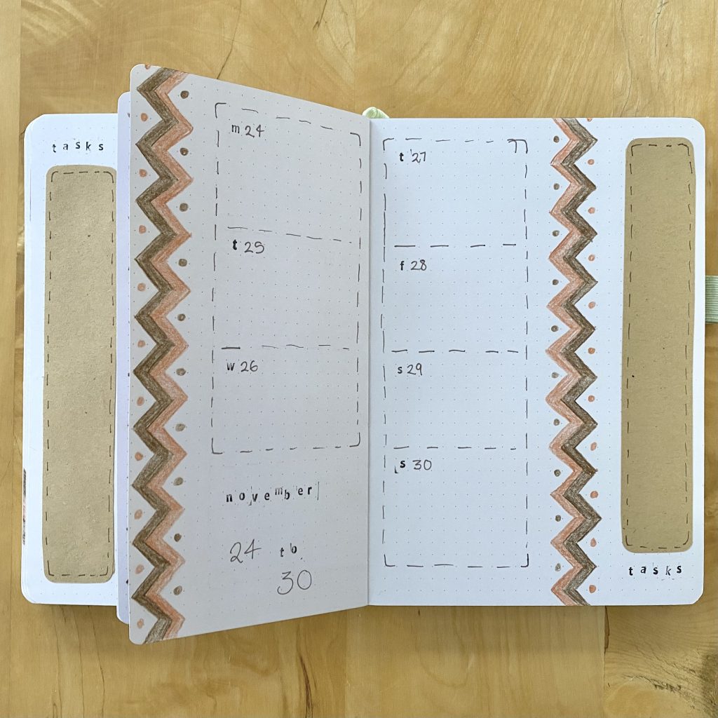 To protect my sanity, I opted to draw just the chevron pattern from my colourwork design as the decoration on most of the other pages in this setup, and for my Monthly Calendar I opted to place it near the bottom. For the calendar itself, I stuck in little squares of kraft paper, then wrote in the dates with my brown fineliner (the alphabet stamps I was using sadly do not contain numbers). Finally, I stamped in the ‘November’ heading vertically, down the left-hand side of the page.