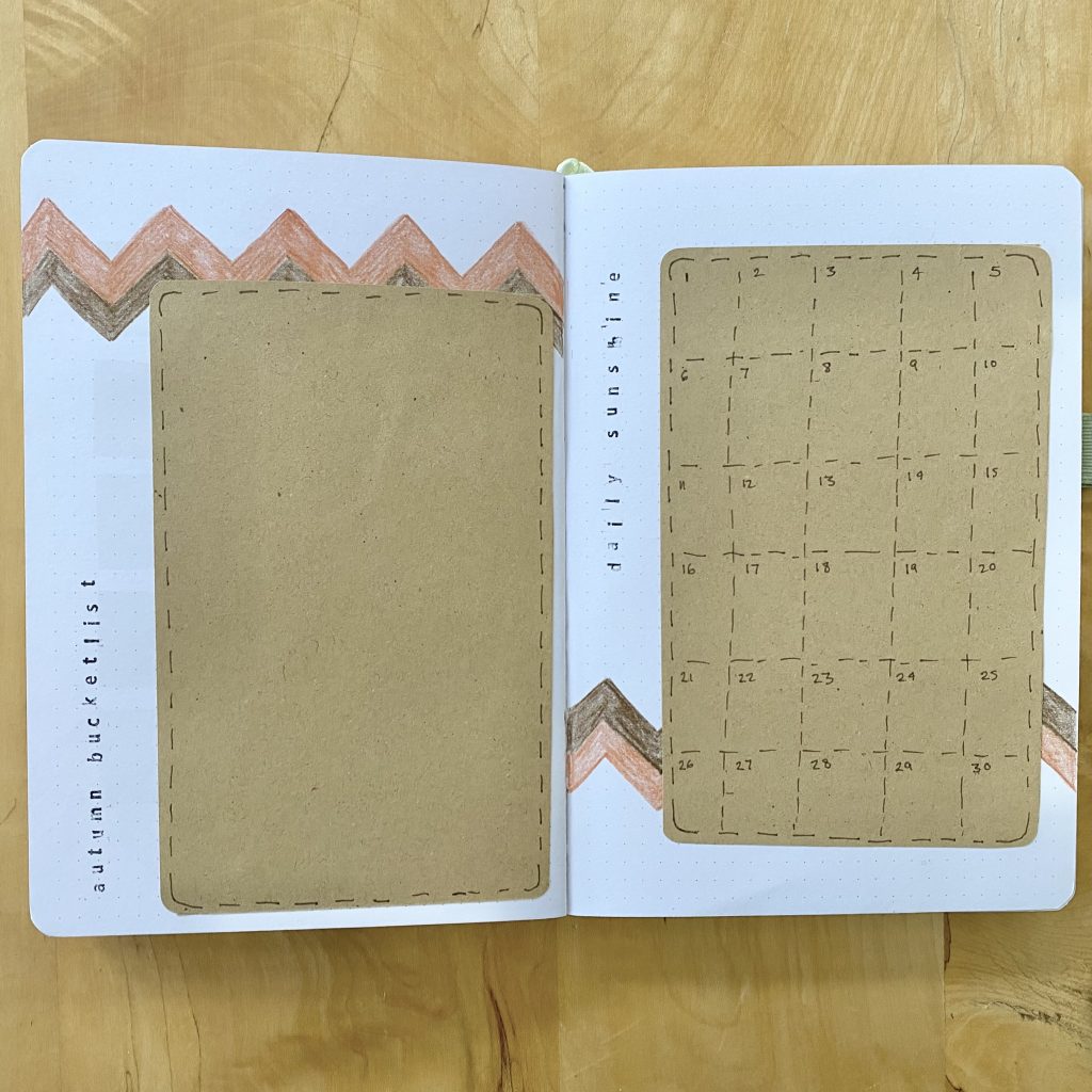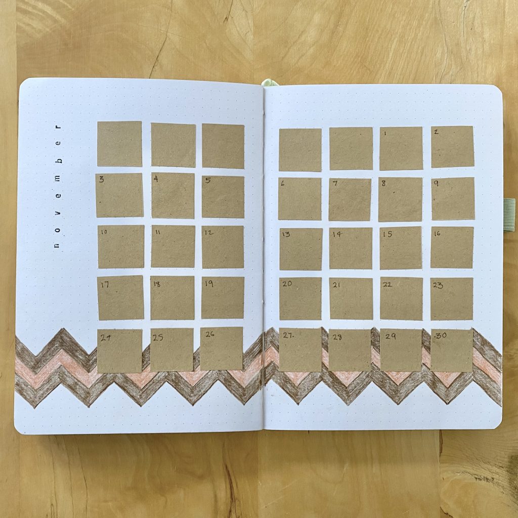 I had actually already set this spread up back when the setup was still in its October phase, so I had to add a few more kraft paper boxes to the end of the month to fit November’s layout (which is why there are 5 blank boxes in the top row… needs must!).