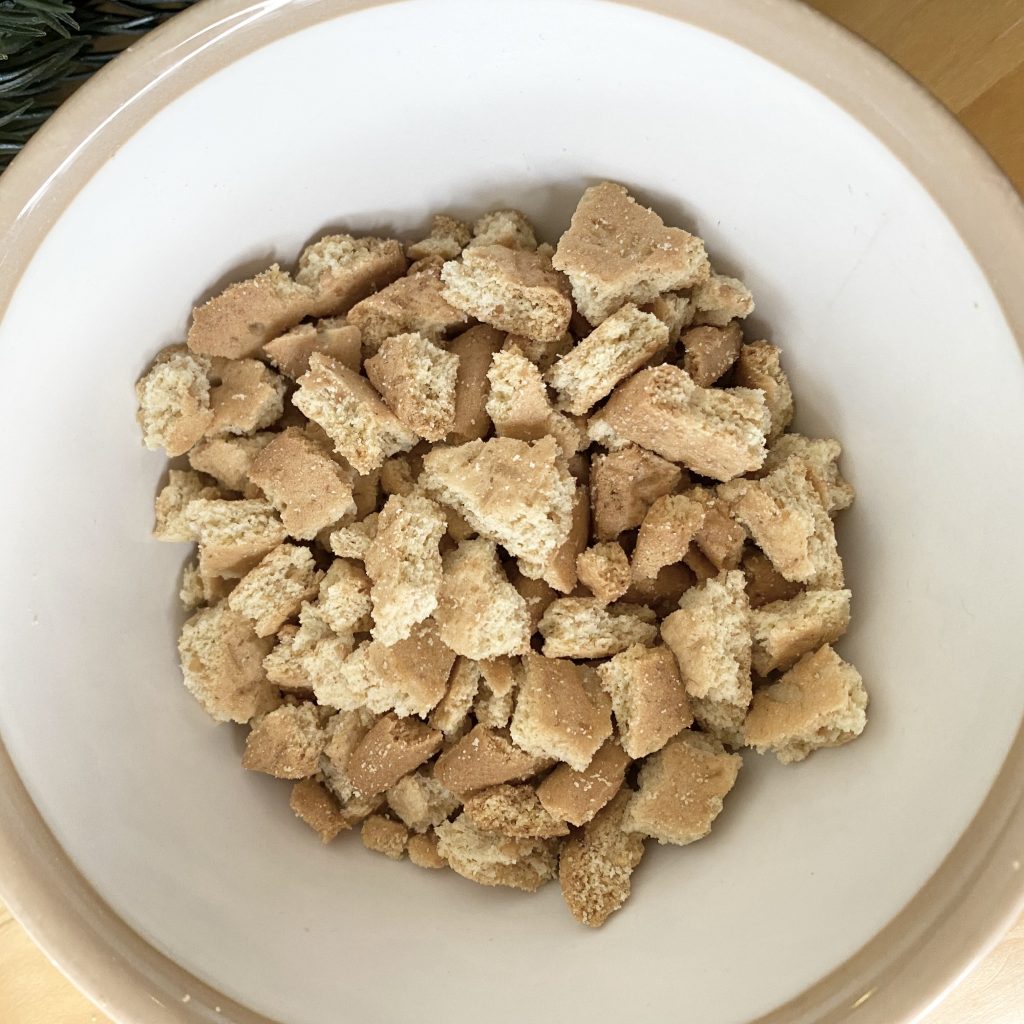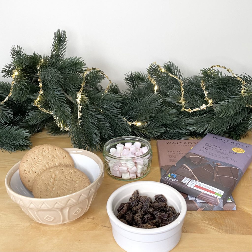 - Break the digestive biscuits into very small pieces. Set them aside. Weigh out the raisins and mini marshmallows and set them aside too, ready for later.