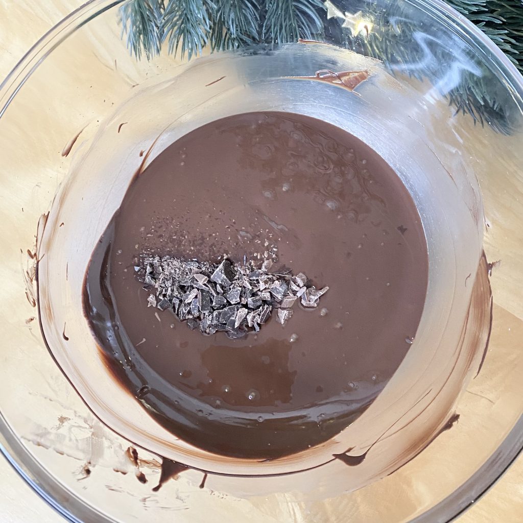 Once the chocolate has melted and is at the correct temperature, add a small amount of the finely chopped, reserved chocolate and stir it in well until it has melted into the rest of the chocolate. The additional chocolate is known as ‘seed chocolate’ and helps the melted chocolate to cool the right way. This, along with the stirring motion, is the key to perfectly tempered chocolate!
