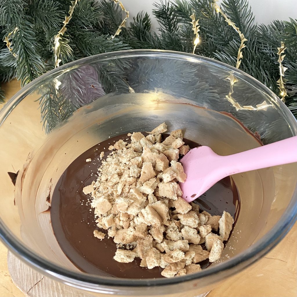 - Break the digestive biscuits up into very small pieces (this helps to keep the bark relatively thin and ensures that the biscuits are evenly distributed throughout the chocolate).
