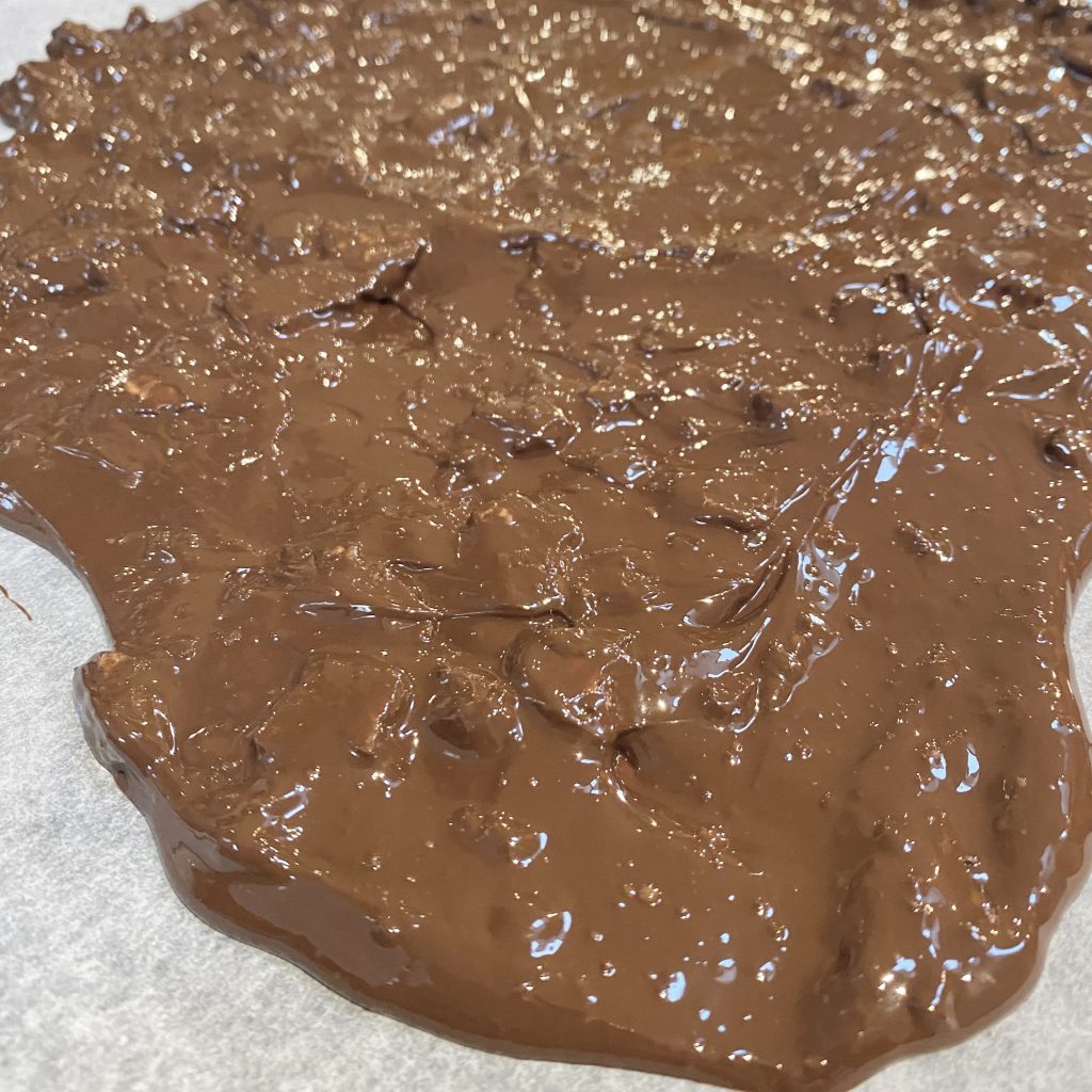 - Tip the chocolate/biscuit mixture onto the lined baking tray and use an offset spatula/the back of a spoon to spread it out quickly into a thin layer.