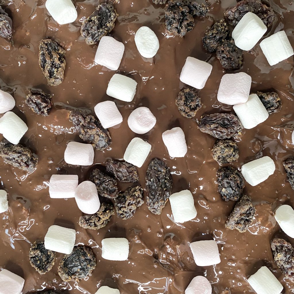 - Sprinkle over the raisins and mini marshmallows, pressing them down gently into the chocolate to make sure they stick.