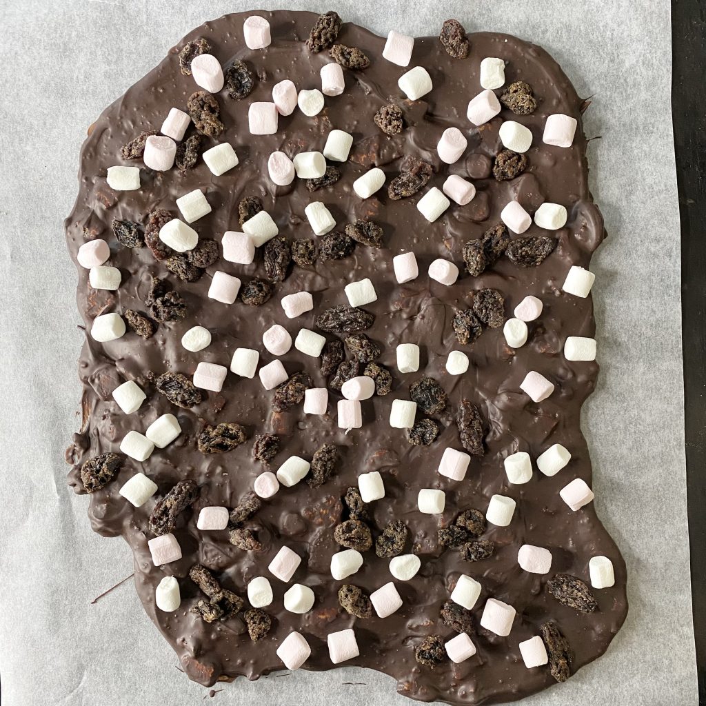 Sprinkle over the raisins and marshmallows, pressing them down gently as you go to ensure that they stick to the chocolate. Continue to work quickly at this point, because if the chocolate sets too hard before the raisins/marshmallows are added, they won’t stick!