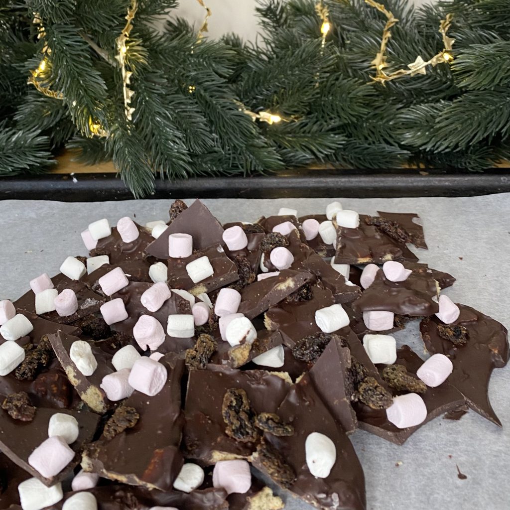 - Weigh out the marshmallows and raisins and have them to hand, ready to sprinkle over the bark.