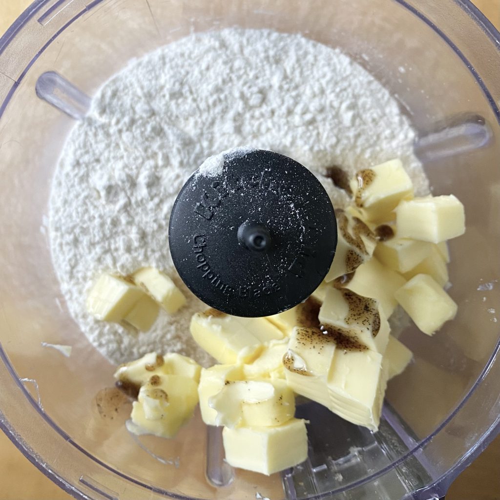- Place the sugar, butter, flour and vanilla bean paste into a food processor. Pulse until a dough forms.