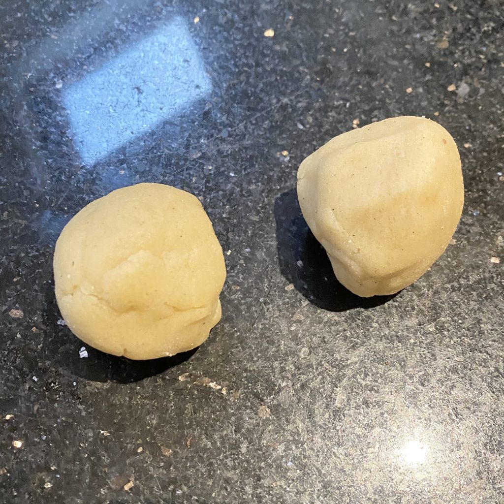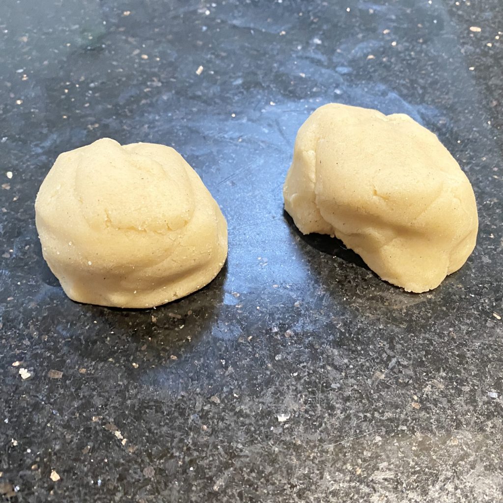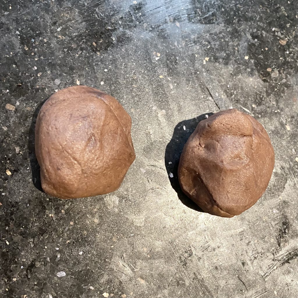 Take one of your dough halves (I’m working with the chocolate dough first here) and divide it in half again, so you have two equal balls of dough (it helps to weigh and divide the dough by 2 here, just like last time, to ensure they’re perfectly even!).