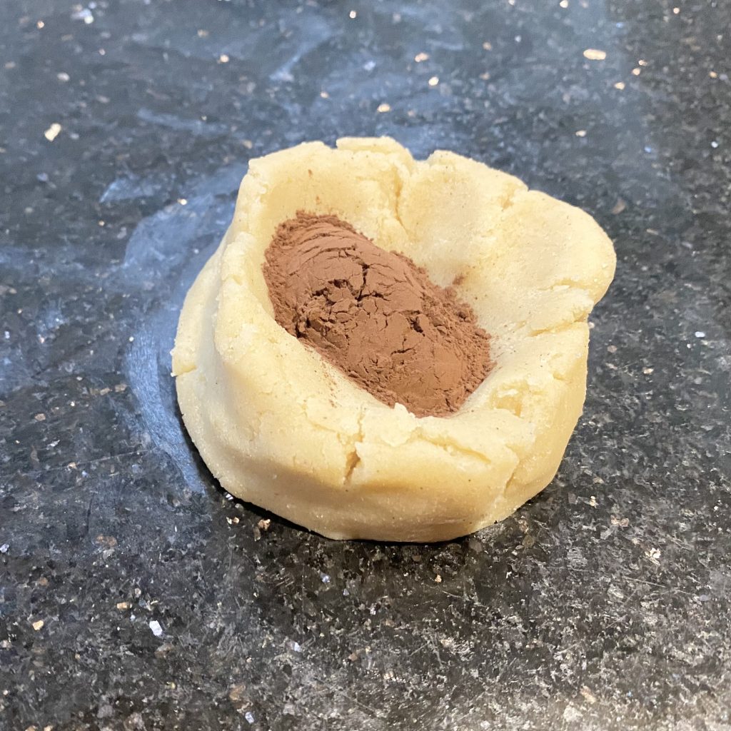 - Knead the cocoa powder into one half of the cookie dough until no streaks of vanilla dough remains.