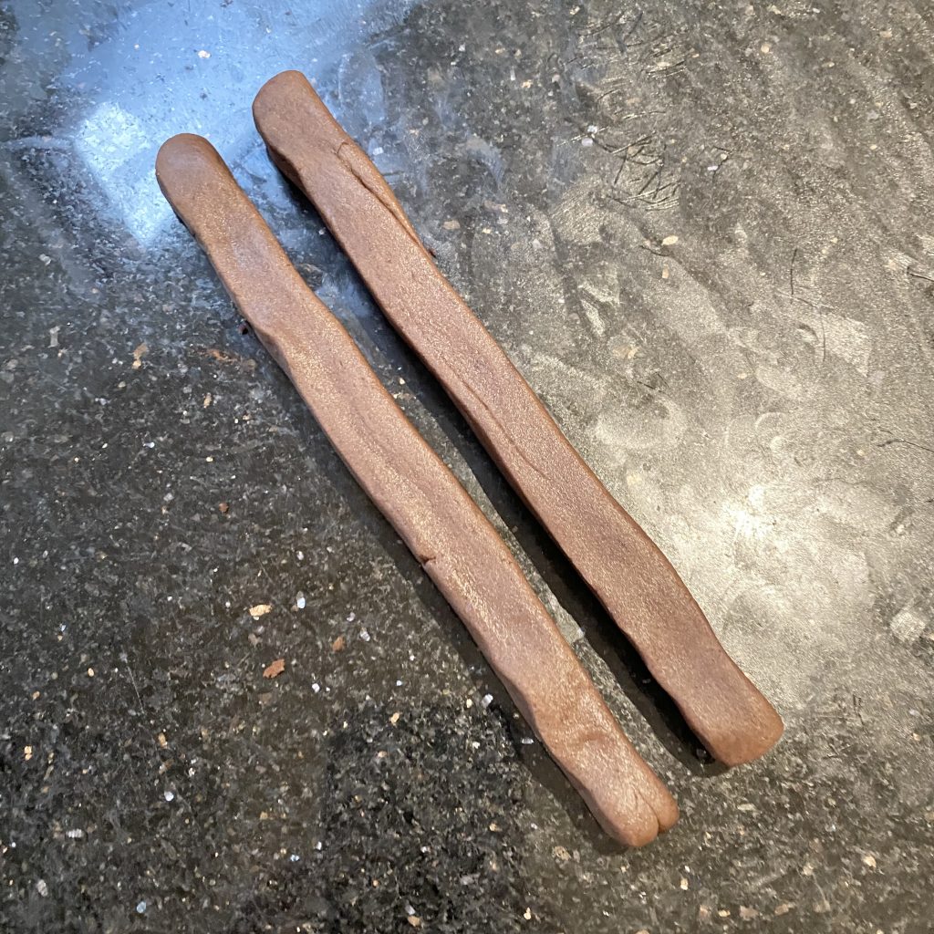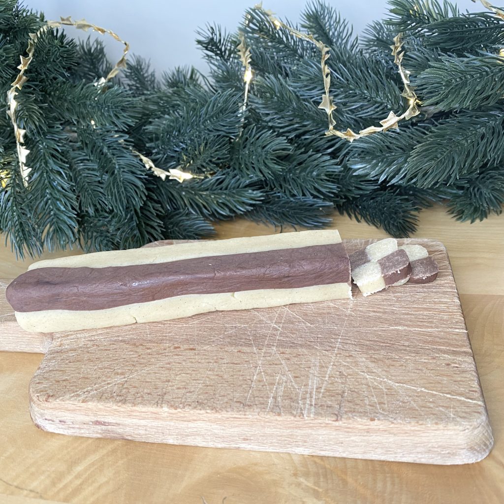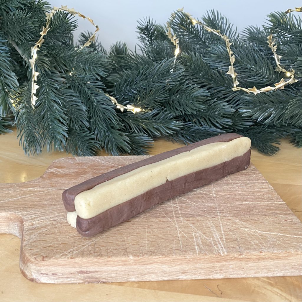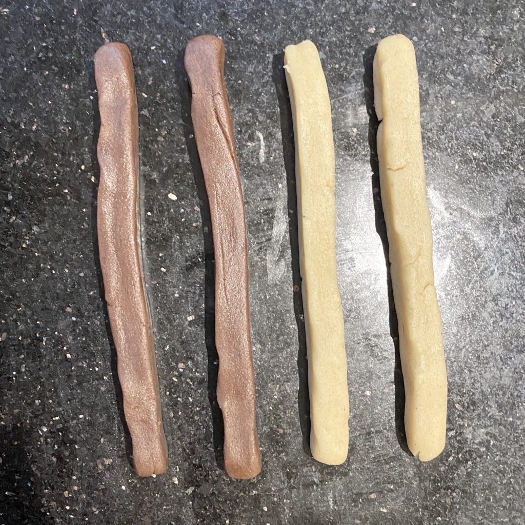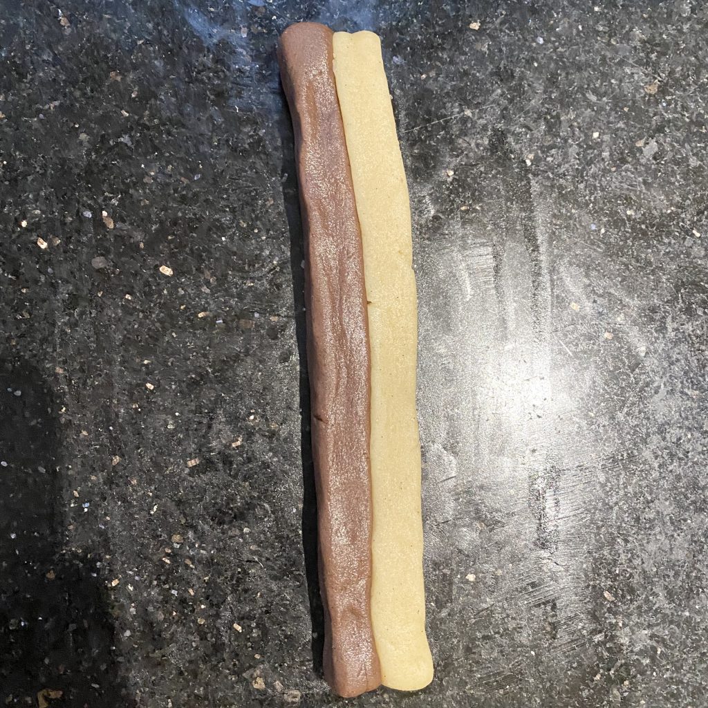 - Divide the vanilla dough into two equal balls. Form each ball into a square log (use a bench scraper/clean metal ruler to really square off the edges), about 1 x 1 x 17cm. Set aside, then repeat with the chocolate dough, so that you have four logs. Do not add any extra flour/cocoa powder at this stageโ you need the dough to be slightly sticky.
