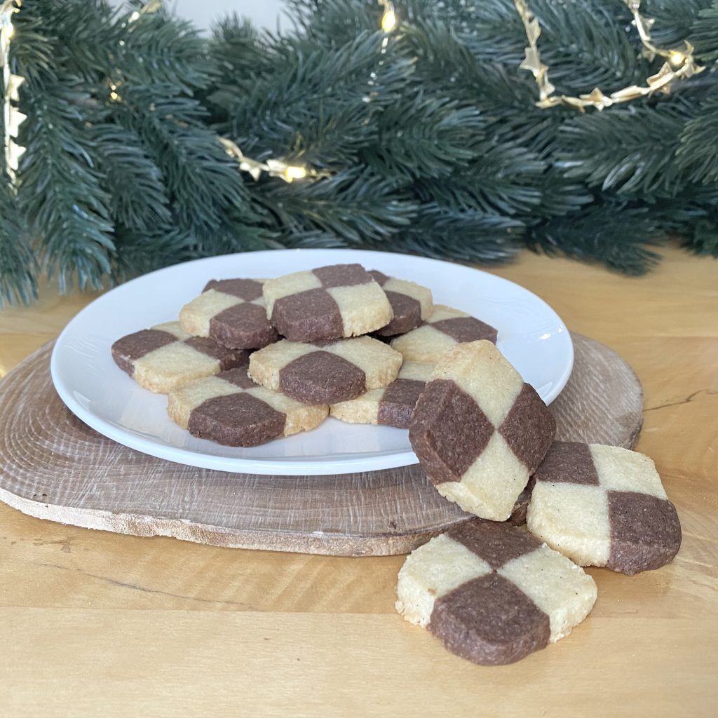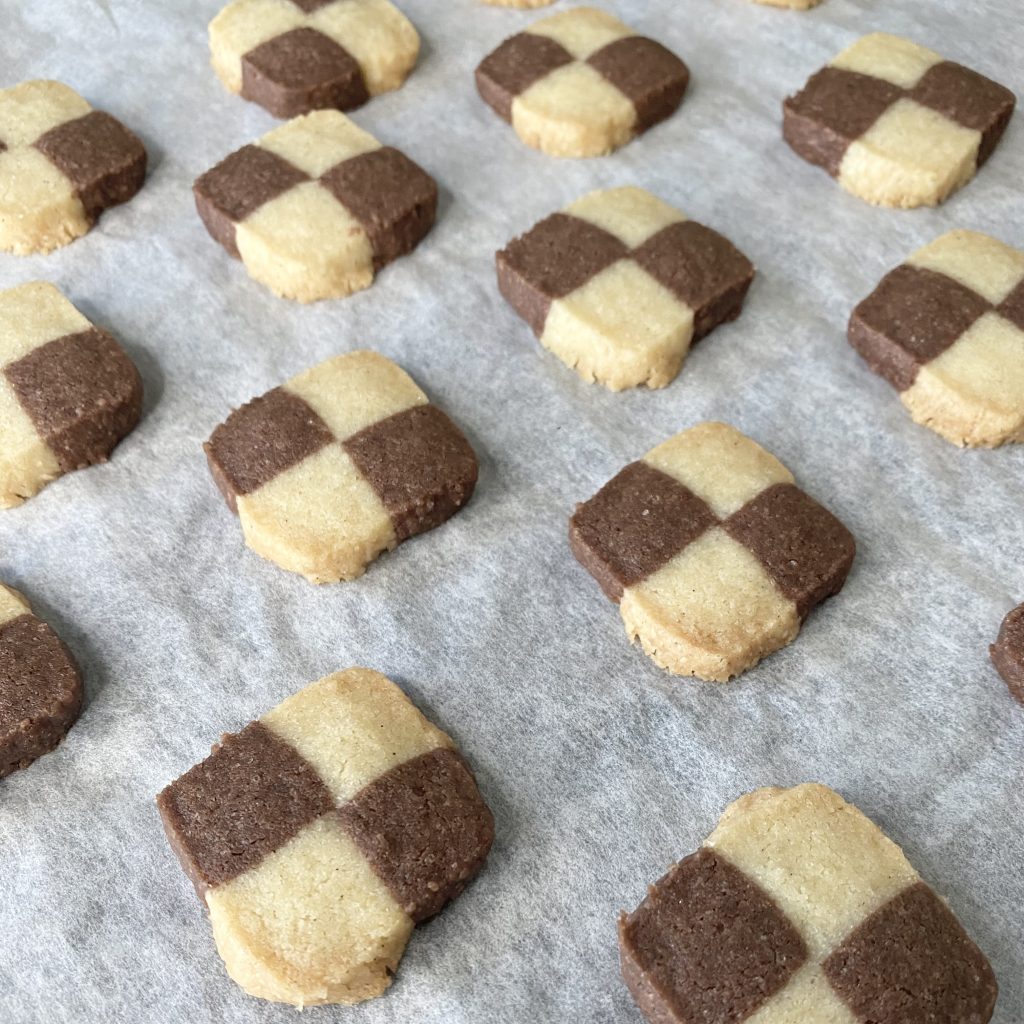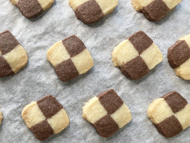 A small amount of cocoa powder is added to half of the dough to give it a chocolate-y flavour and a deep brown colour, which contrasts nicely with the vanilla dough and helps the checkerboard design to really stand out.